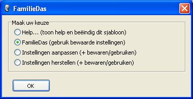 Na het starten van het sjabloon wordt het menu hiernaast getoond. Het sjabloon slaat de laatst gekozen instellingen op in het bestand familiedasparmbest.cfg,