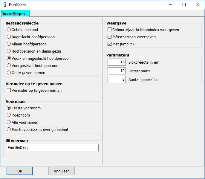 - Mapnaam voor de uitvoer - standaard wordt de uitvoer geschreven naar de submap FamilieDas van de standaardmap voor Rapportuitvoer