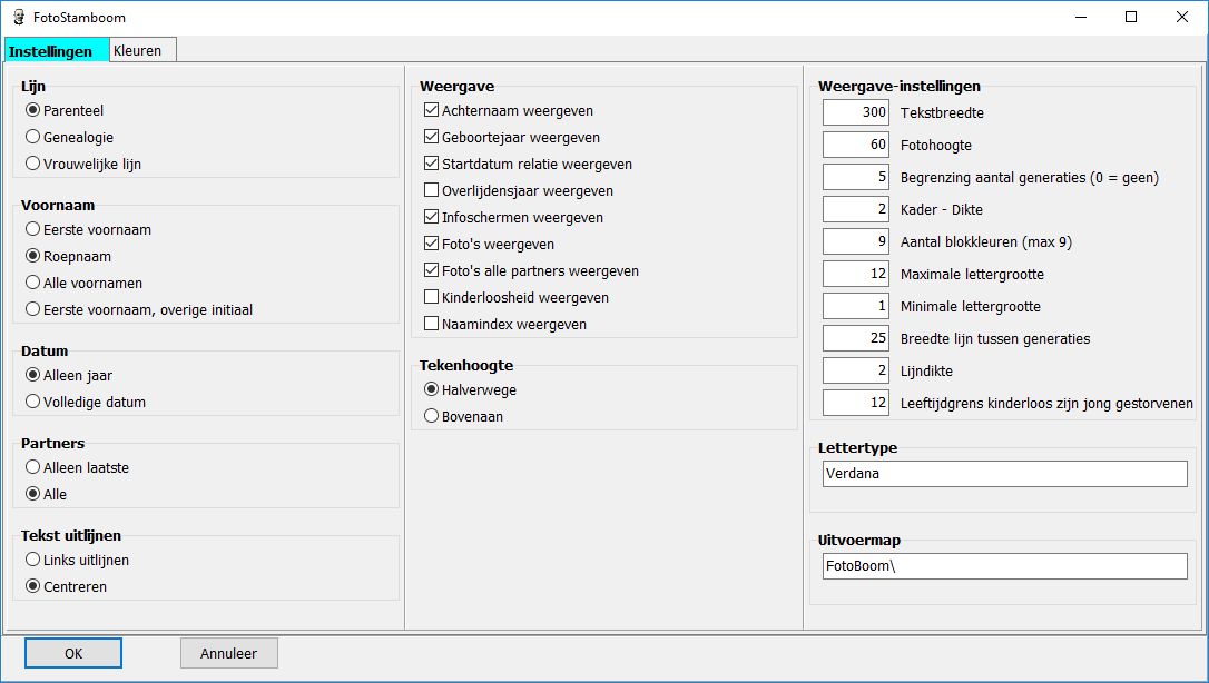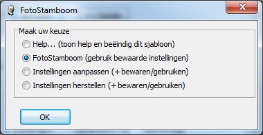 zodat deze een volgende keer weer gebruikt kunnen worden, via de menukeuze "FotoStamboom (gebruik bewaarde instellingen)".