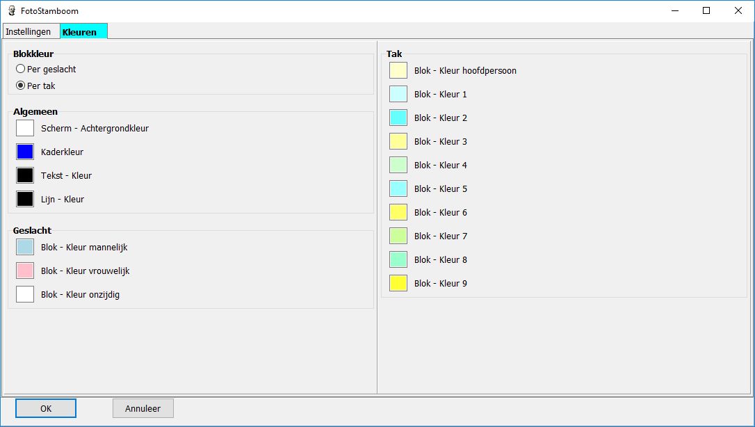 Bij de keuze "per nageslacht" wordt per kind in de tweede generatie + diens afstammelingen een kleur toegekend